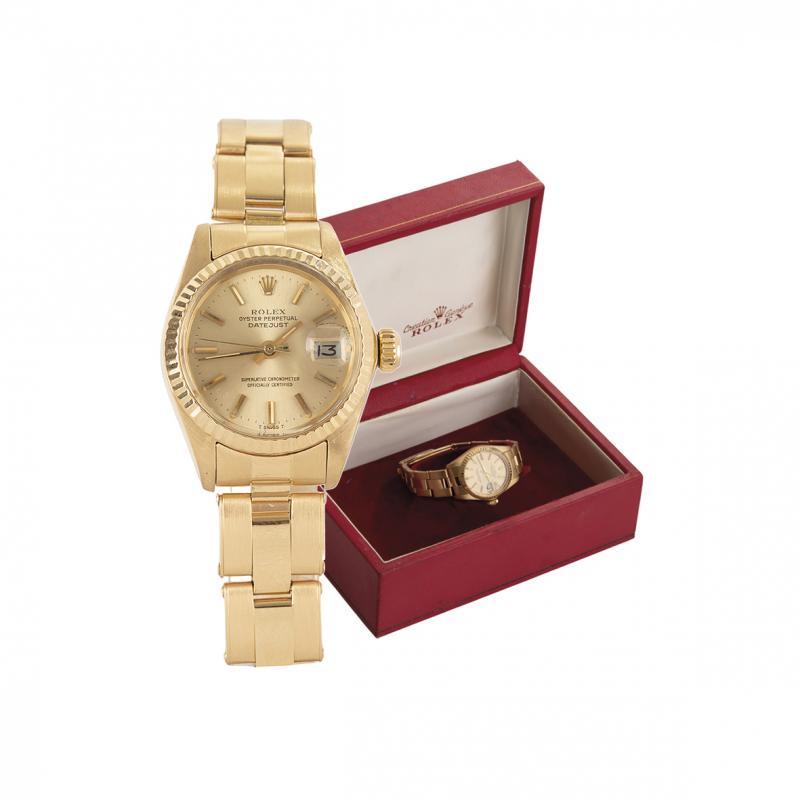 ROLEX. Relógio Datejust de ouro amarelo com movimento automático, calendário, vidro de acrílico, ano 1980. Com estojo e certificado originais. Caixa 26mm. Pulseira oyster 17cm.