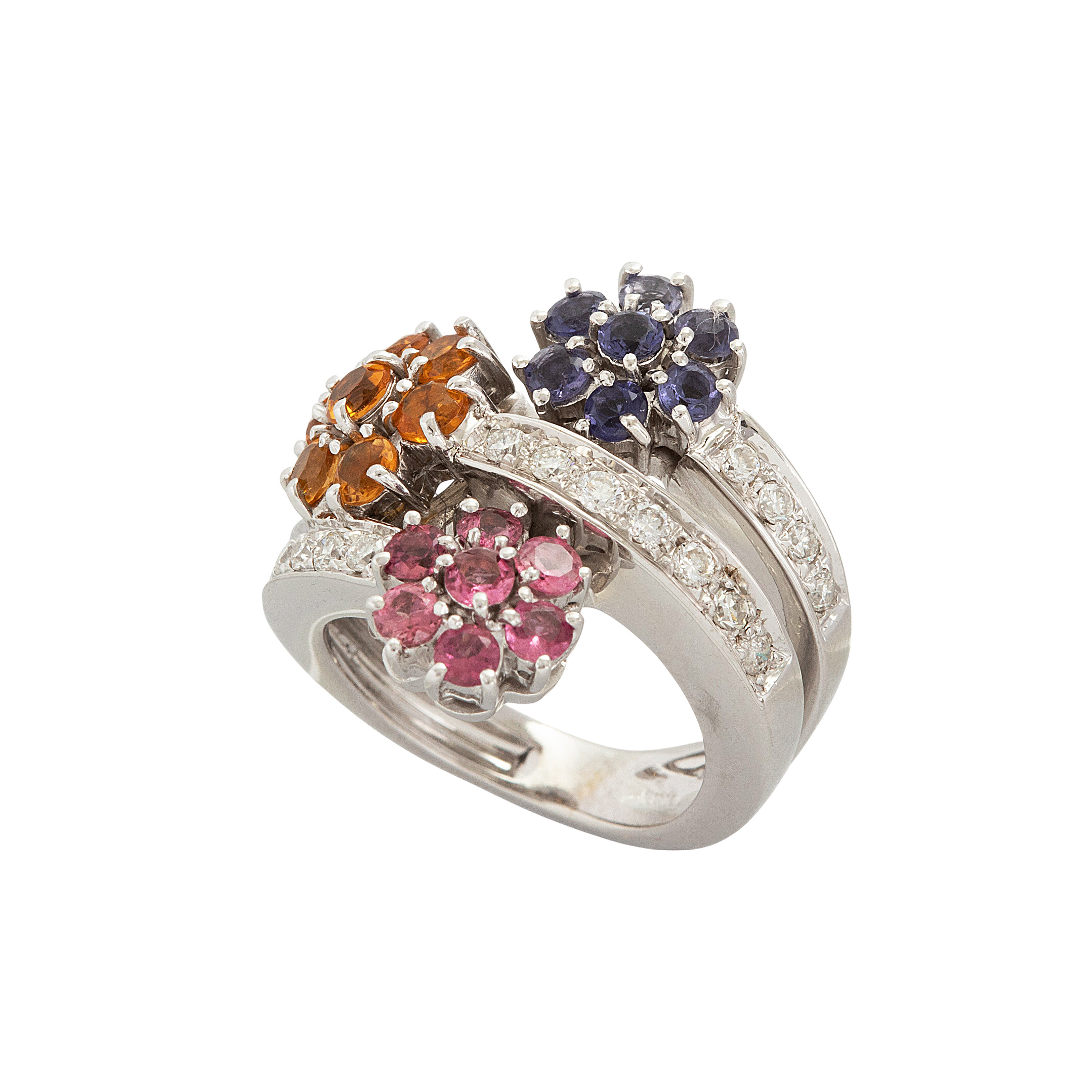 Anel de ouro branco com turmalinas rosa, iolitas, berilos, 0,32ct de brilhantes e 12,3g. Medida 11.
