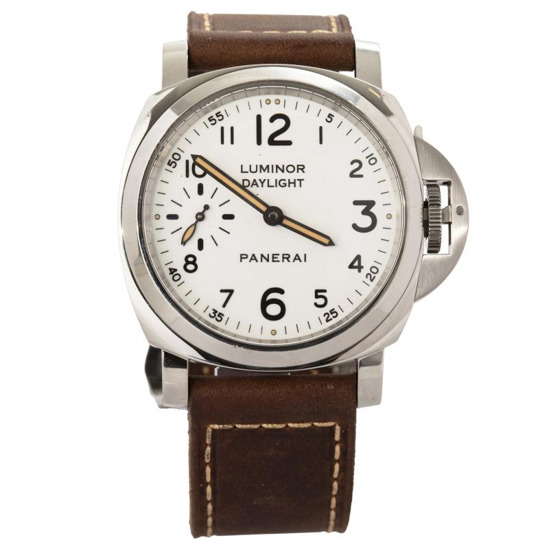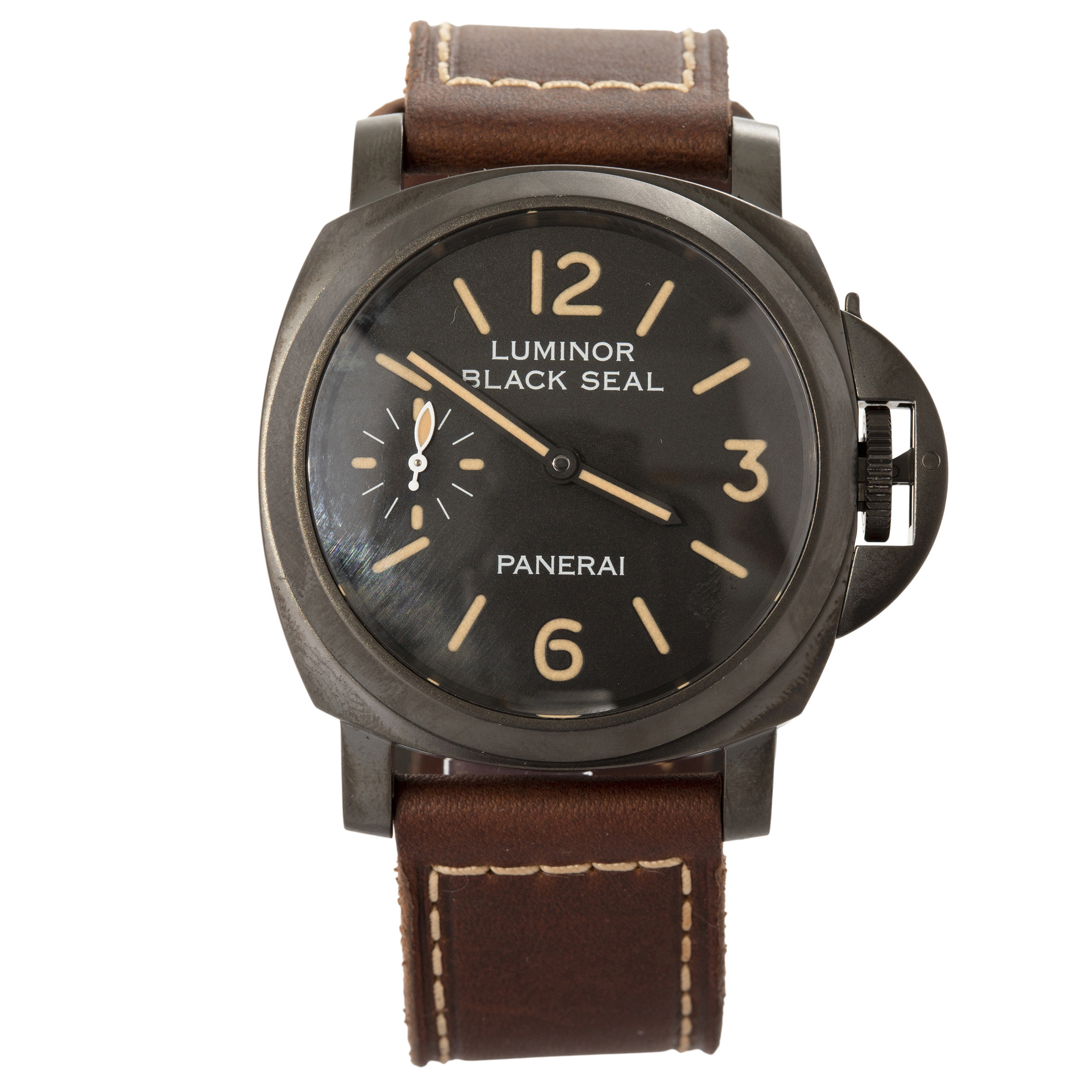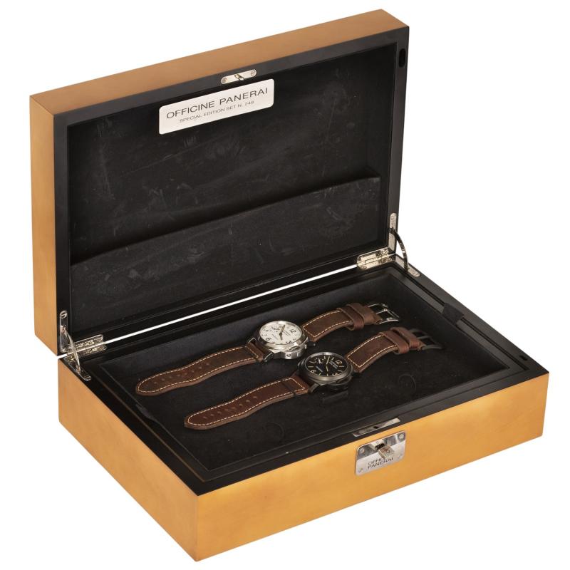 PANERAI. Conjunto Edição Especial de 2 relógios: -Luminor Black Seal 8 days Acciaio Dlc de aço com corda manual, vidro de safira, anos 2010. Com estojo e certificado originais. Caixa 44mm. Pulseira de couro 23cm. -Luminor Daylight 8 days Acciaio de aço com corda manual, vidro de safira, anos 2010. Com estojo e certificado originais. Caixa 44mm. Pulseira de couro 23cm.