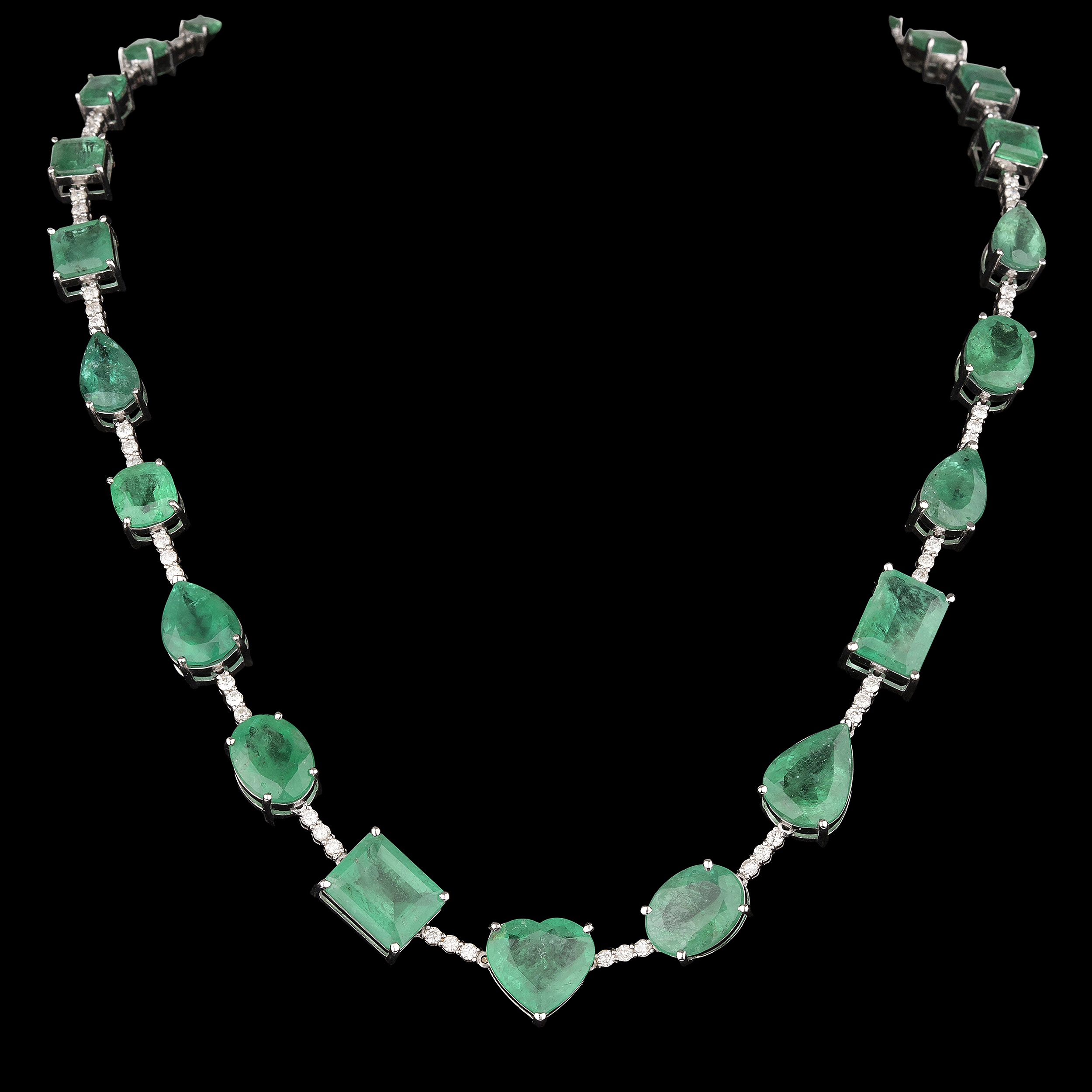 Gargantilha de ouro branco com 40,55ct de esmeraldas, 2,60ct de brilhantes e 37,1g. Medida 42,5cm.