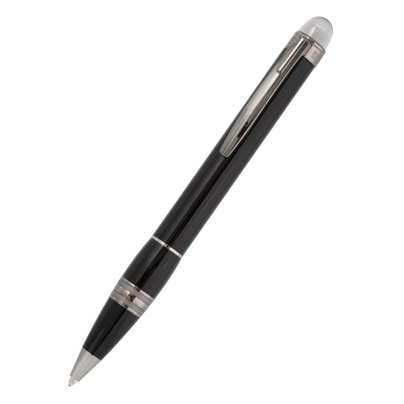 MONTBLANC. Caneta Starwalker esferográfica de resina preciosa com detalhes revestidos de reutênio e emblema flutuante. Com estojo original. Medida 13,6cm.