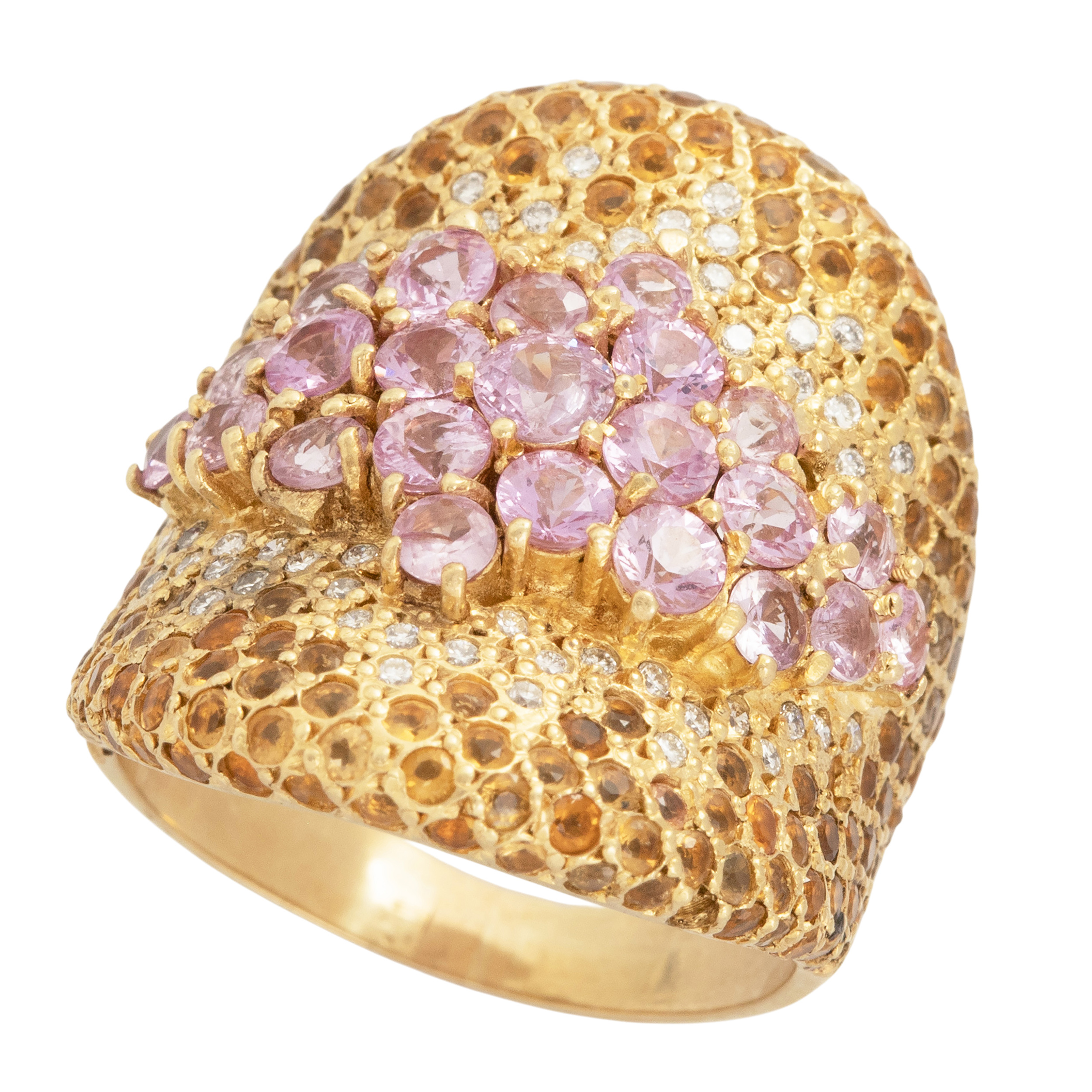 Anel de ouro amarelo com safiras rosa, citrinos, 0,30ct de brilhantes e 13,4g. Medida 21.